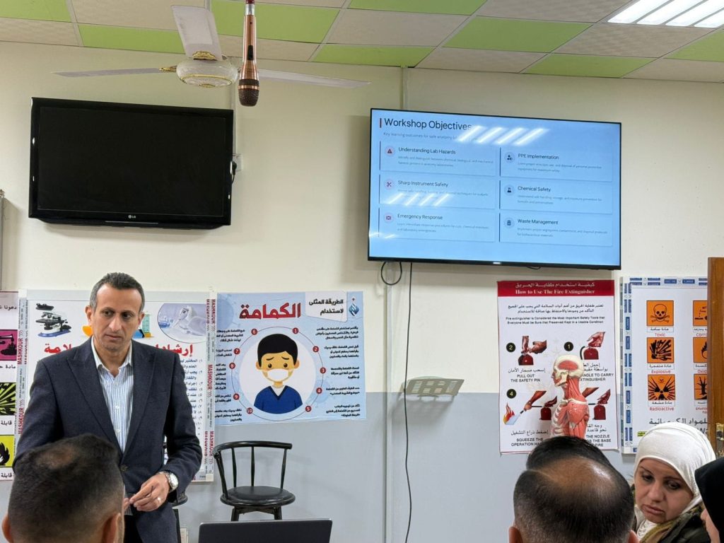 وتضمنت الدورة عدة محاور أساسية، من أبرزها مبادئ السلامة العامة في المختبرات التعليمية لفرع التشريح البشري، وإجراءات الوقاية الشخصية وطرق الاستخدام الصحيح لمعدات الحماية، وآلية التعامل الآمن مع المواد والأدوات المختبرية، فضلاً عن تدريب عملي على خطة الطوارئ الخاصة بمختبرات التشريح وآليات التصرف السليم في الحالات الطارئة، بما يسهم في ترسيخ المفاهيم التطبيقية وتعزيز الجاهزية لدى المشاركين.