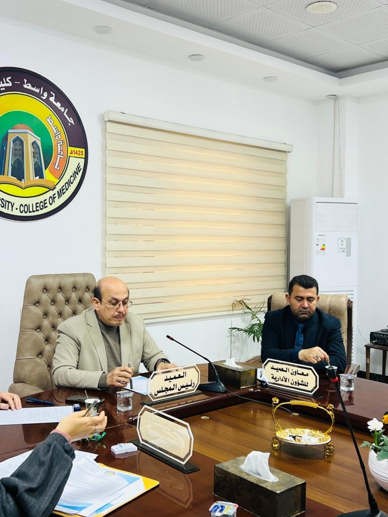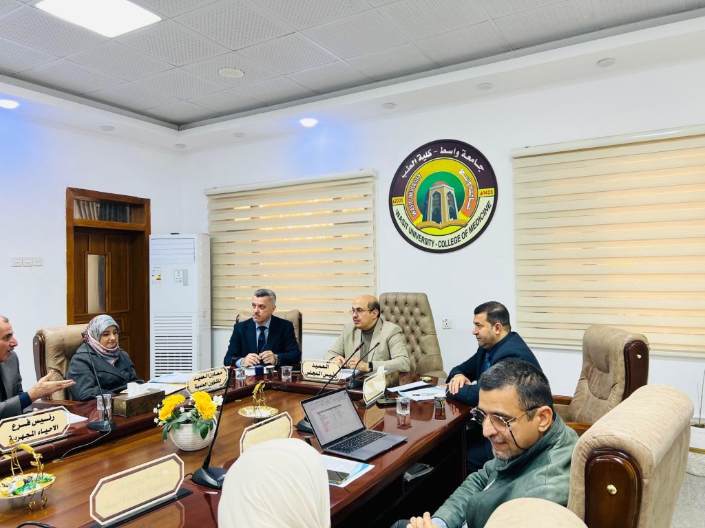 The Faculty of Medicine Council at Wasit University held an official meeting attended by the Dean of the Faculty, Assistant Professor Dr. Nasir Kazim Al-Maliki, and his assistants, with the participation of all faculty members.
